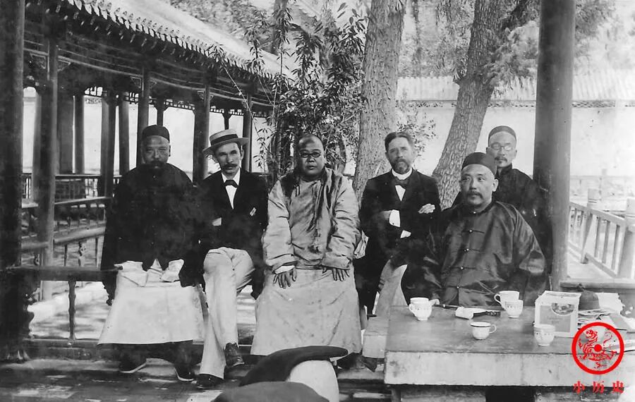 这张照片拍摄于1901年,地点在山东巡抚衙门内,Dr. Hedley摄影。当时巡抚大人袁世凯、山东商务局总办唐绍仪(老袁身后那位)等人与外国客人喝茶聊天,话题涉及通商和利权。袁世凯从担任山东巡抚开始,但凡有外事活动,一定会带上唐绍仪。