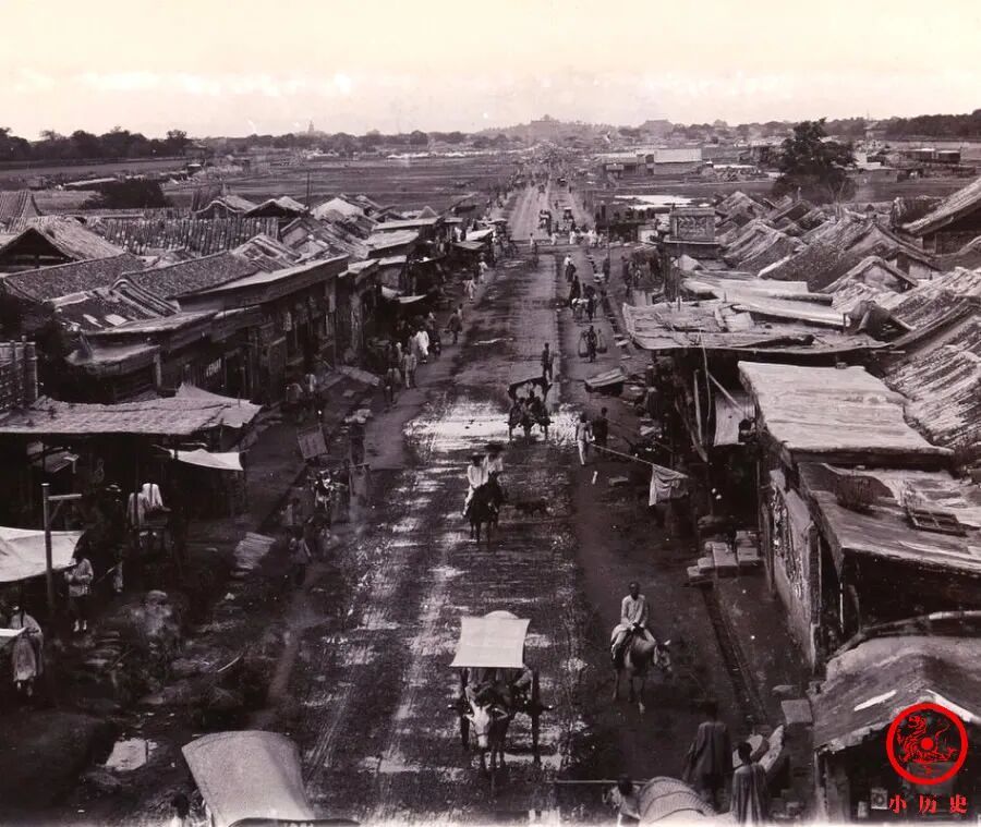 永定门内大街位于北京中轴线上,地处外城区域,是从南部出入京城的通衢要道。沿着大街向北望,依稀可以看到远处的景山。这张照片应该是在永定门城楼上拍摄的。