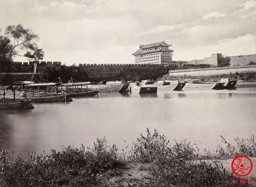 镜头近处的河道是东护城河,远处高大的建筑是内城东南角楼。八国联军曾炮击东南角楼,致其破损十分严重。