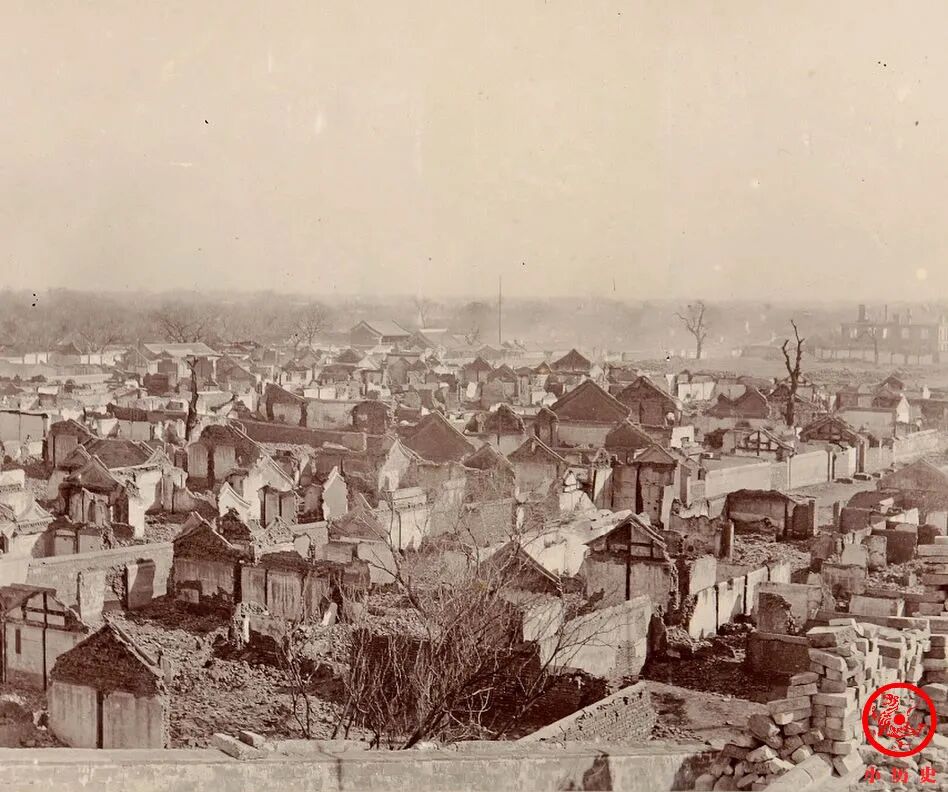 视野所及之处没有一处完整的房屋,这个场景真是触目惊心。1900年6月16日,义和团在前门大街一带火烧洋货店。据仲芳氏《庚子记事》载:“先是义和团在老德记大药房将火点起,令四邻焚香叩首,不可惊乱。及至延及旁处,团民不许扑救,仍令各家焚香,可保无虞,切勿自生慌扰。既至火势大发,不可挽救,而放火之团民,已趁乱逃遁矣。是以各铺户搬移不及,束手待焚,仅将账目抢护而已。”大火烧毁店铺4000余家,前门城楼也被烧塌。