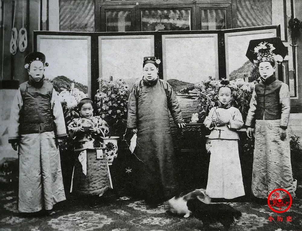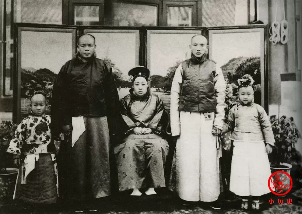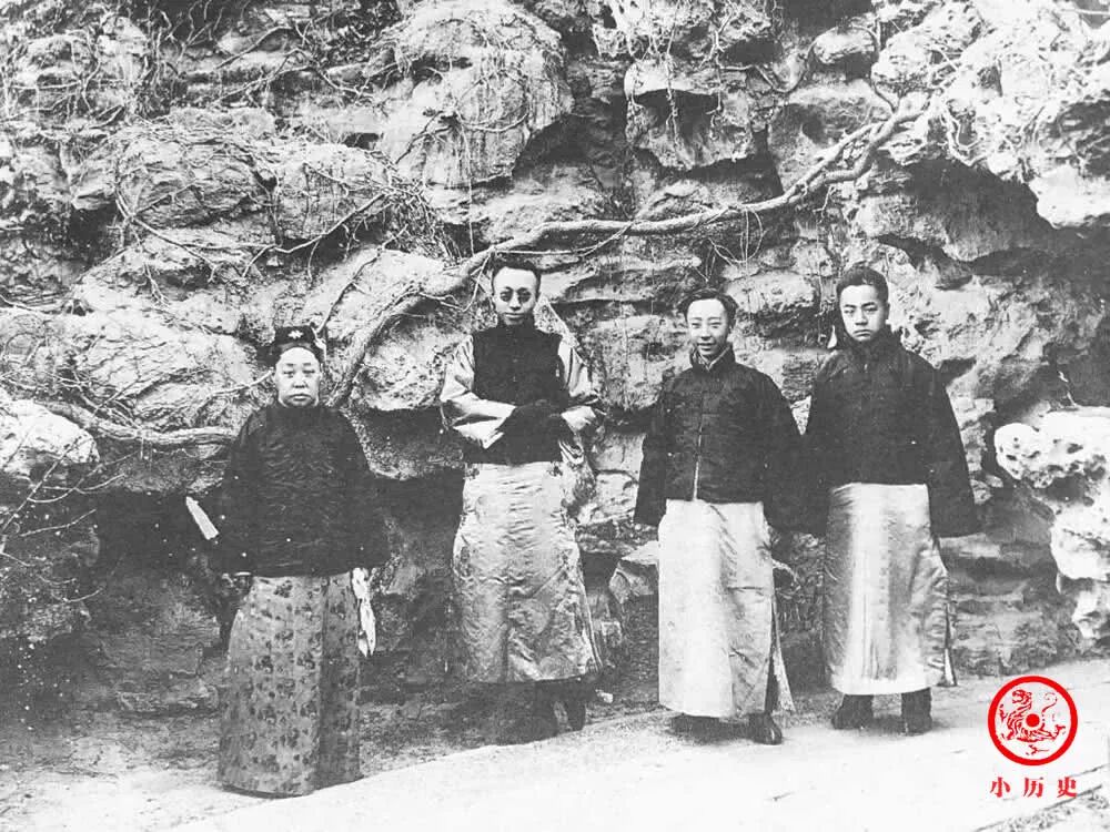 端康太妃与溥仪、溥杰、毓崇在紫禁城御花园合影。