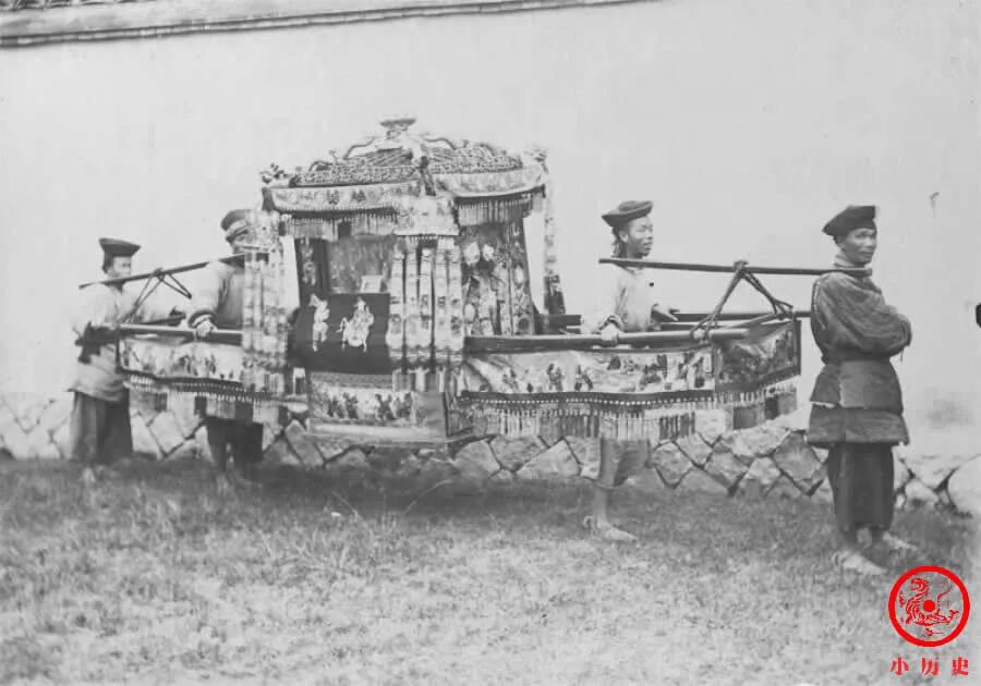 这台花轿装饰精美繁复,如果是彩照的话,就会看到它以大红为主色调,搭配了多种绚烂色彩。坐在轿内的新娘子迎来了一生中的高光时刻,随后将进入生儿育女、伺候公婆的家庭生活,每天一睁眼就有一大堆家务活等着她。