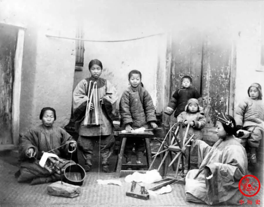 纺线织布是传统社会农家妇女的必备技能,她们从小就开始学习,如果学不好是很难找到婆家的。画面中有的孩子将棉絮做成棉条,有的摇动纺车将棉条纺成棉线,还有的将纺好的棉线缠成线团。有了足够多的棉线,就可以拿去织布了。