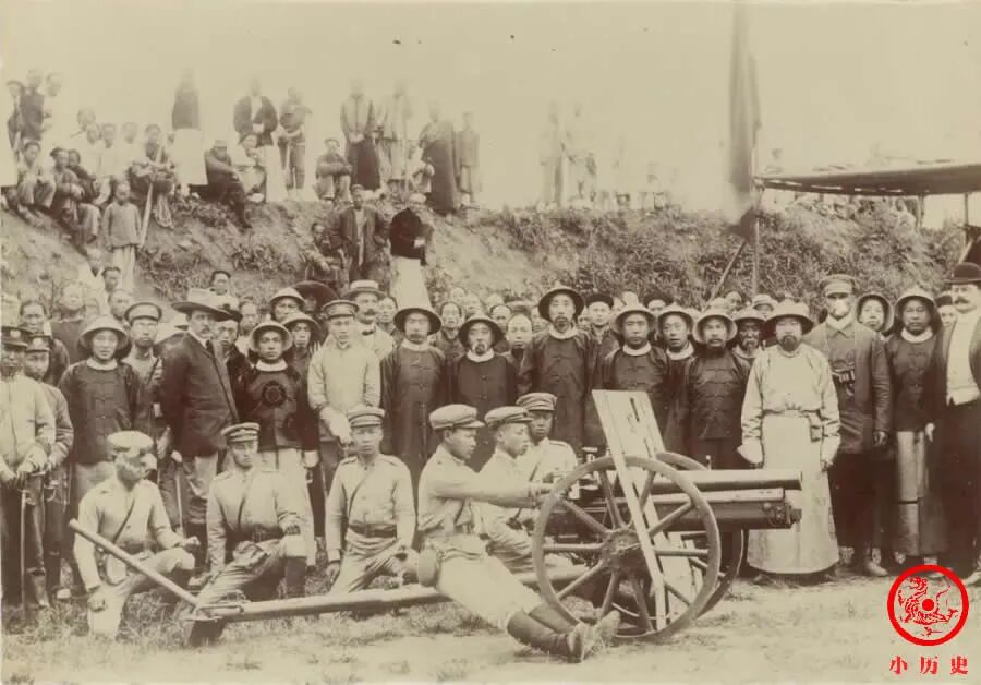 两江总督端方(前排靠右胖子)、江苏巡抚瑞澂(前排中间瘦高个)等积极推行新政,编练新军,照片记录了他们视察新军建设,并与炮兵合影的情景。新军建设是清廷于即将崩溃之际维持其统治的最后挣扎,编制和训练效仿西方军队,配备洋枪洋炮等武器。