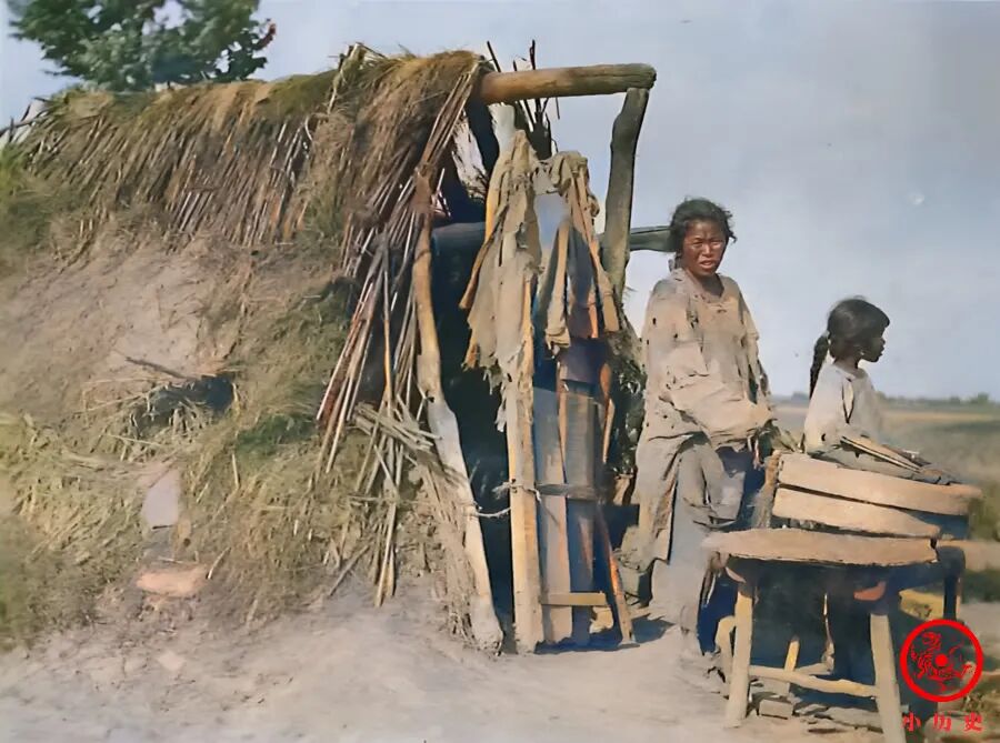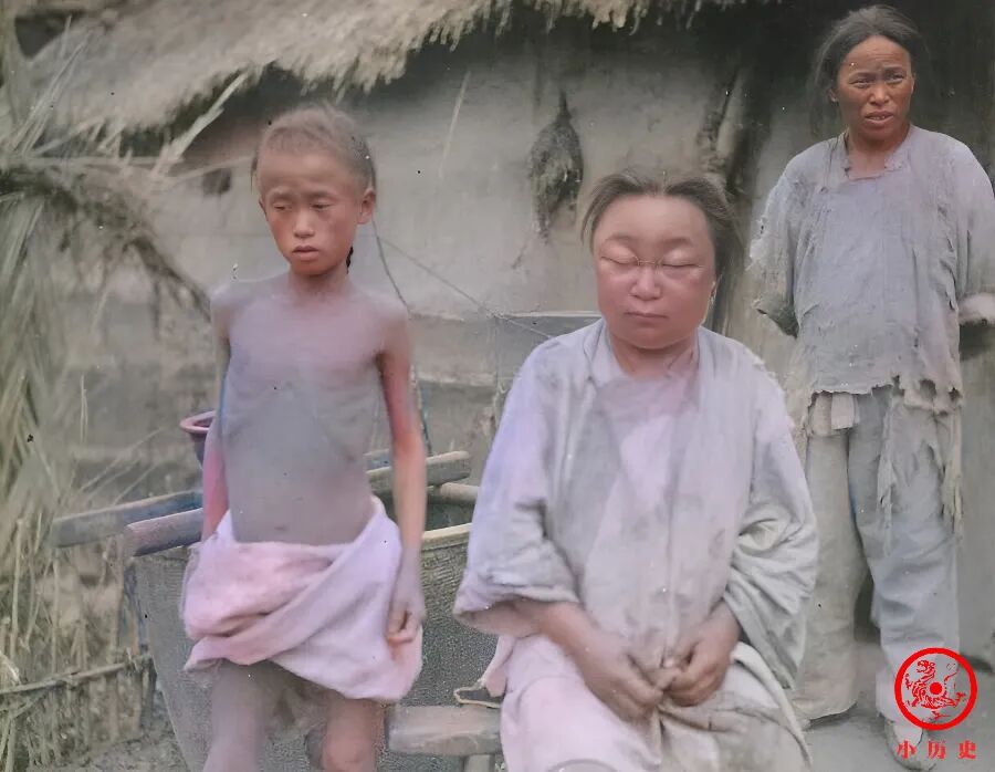 这位农村妇女不知得了什么病,头部肿胀,病情严重,双眼都睁不开了。从她所处的环境来看,她的家非常贫穷,住茅草屋,根本没钱看病。那个男孩骨瘦如柴,严重营养不良;她身后的人衣衫破烂,饱经岁月的风霜,已经看不出性别。这样的处境,只能让她忍受病痛。