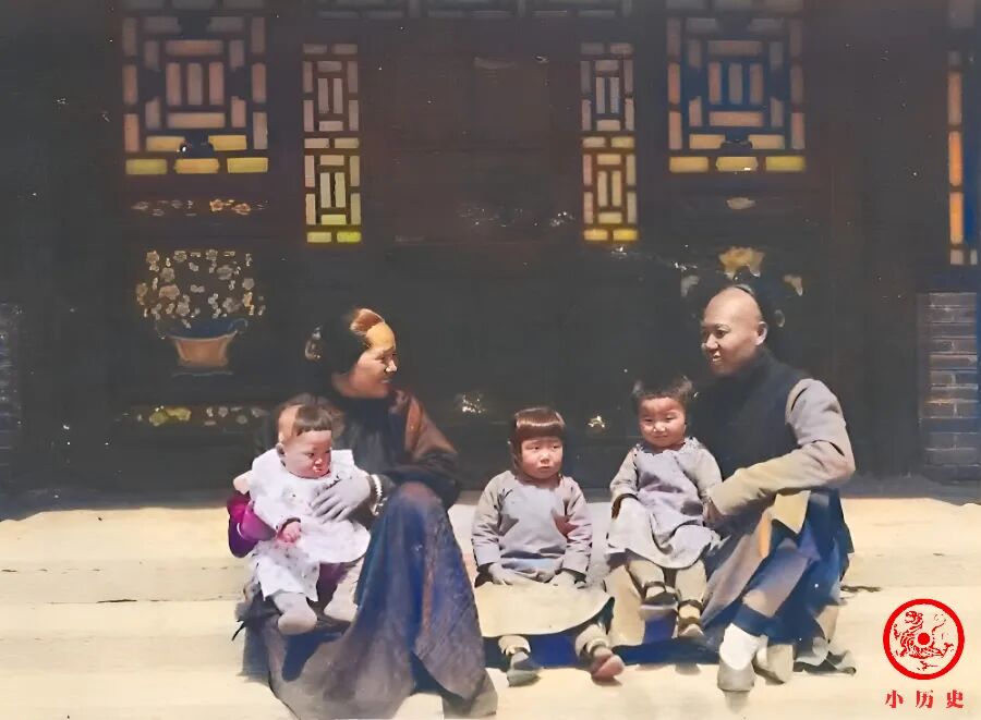 这位妇女与孩子和丈夫在一起,开心地笑着。她的丈夫是汇文大学堂的教师,思想比较开明,“三纲五常”之类的礼教规则对家庭的束缚没有那么令人窒息,所以在合影时很自然地真情流露,一家人和和美美。