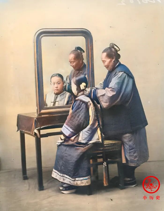在一个旗人家庭里,奶奶为孙女梳头,然后插一朵漂亮的小花。那个女孩留了长长的头发,可能从出生就没剪过。她们在镜子前拍照,把她们360度的形象都展示了出来,这样的摆拍非常巧妙。