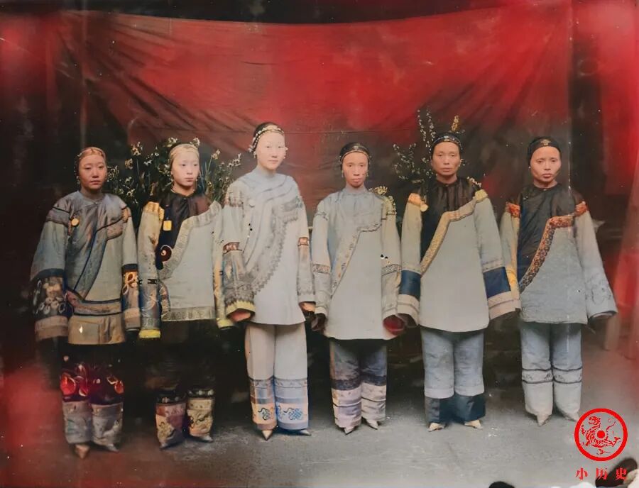 很明显能看出来,这6位女子生活优越、经济宽裕,她们头戴的抹额、身穿的袄裤都很精美,做工繁复、纹饰多彩。平民女子与富贵女子在服饰上的显著差别,就是前者“素”,后者“花”。我们能从这张照片获得一个信息,富贵人家的妻妾并不是个个都漂亮,她们的出身(尤其是妻)比外貌更重要。