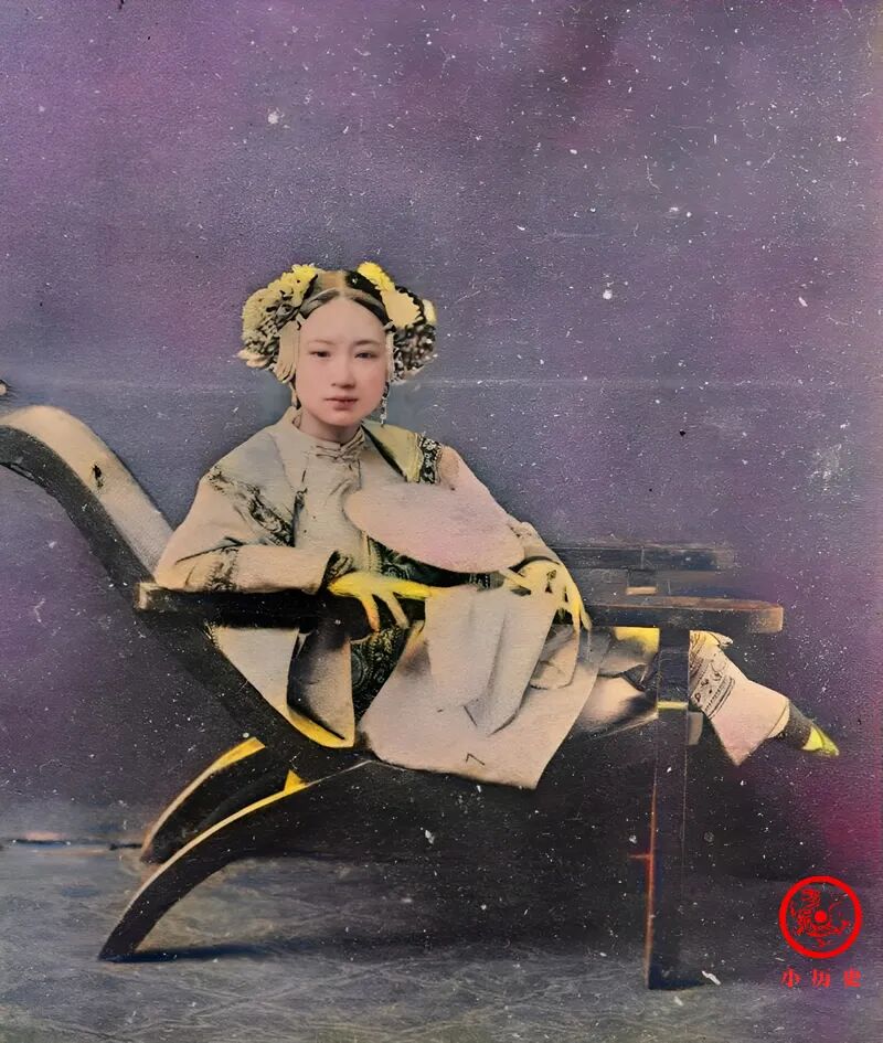 这位女子在当时应该算是标准美人,手中的书籍为她增添了几分娴雅的气质(尽管她未必认识多少字)。她戴着抹额、穿着素净镶边的袄裤,还裹着“三寸金莲”,全身上下透露出浓浓的时代气息。一个柔弱的女子,被裹小脚深深地伤害,不知道带给她多少痛苦!