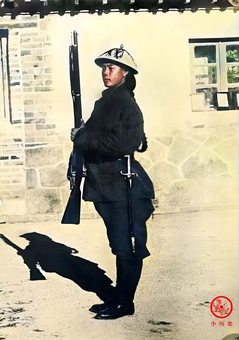 这张照片为我们展示了清朝建设新军的部分成果,士兵的精神面貌可谓大为改观。他全身的装备带有明显的过渡色彩,凉帽、肥大的服装都是清军早已有之的(但更加简洁),佩剑、皮鞋等又是新式军队的标配。