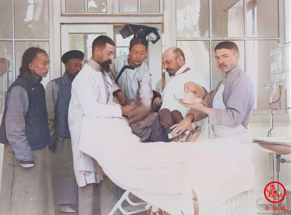 照片显示的是一个旗人家庭带孩子到西医医院看病。那个年代一般老百姓对西医的认可度比较低,只有少数接触过外国人、对西医有所了解的前卫人士,才会做出如此选择。右二谢顶的医生在给孩子清理伤口。
