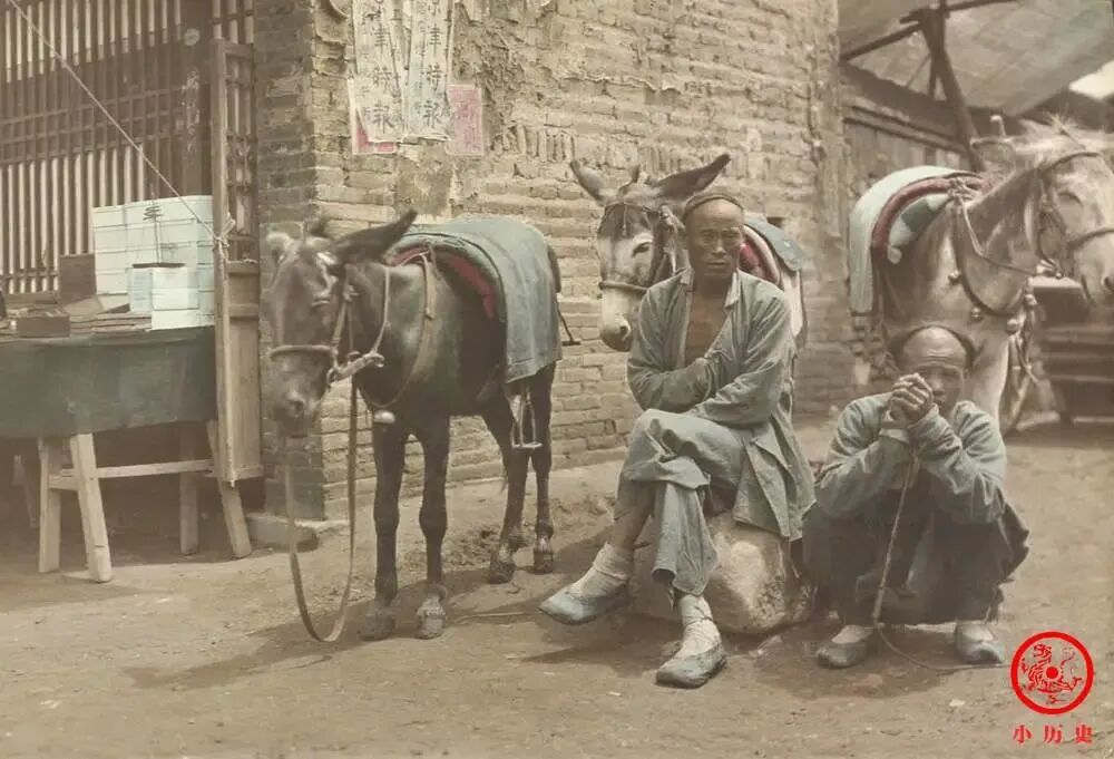 在街角,两名男子牵着几匹毛驴,等着主顾上门。这种出租牲畜的小生意在旧社会很常见,既可以驮人,也可以拉货,相当于城里居民有需求之时的“出租车”。