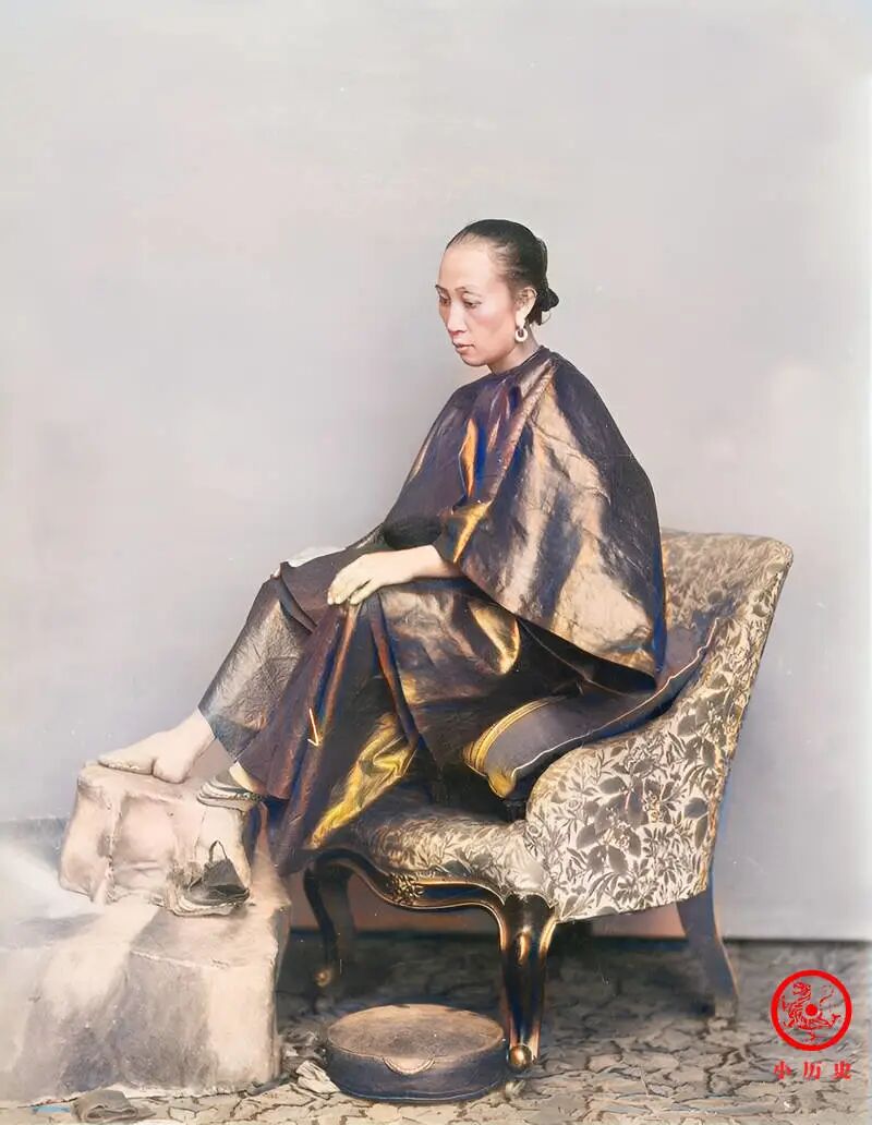 裹小脚是封建礼教强加给女性的枷锁,把她们禁锢于深闺之中,“大门不出二门不迈”,承担生育、做家务的任务,在社会生活中依赖于丈夫。在那个封闭的时代,妇女很忌讳在陌生人面前暴露面部和手肘以外的皮肤,让她脱下鞋子拍摄并不容易,摄影师肯定做了很多沟通与协调,甚至可能用了一些银两做辅助。