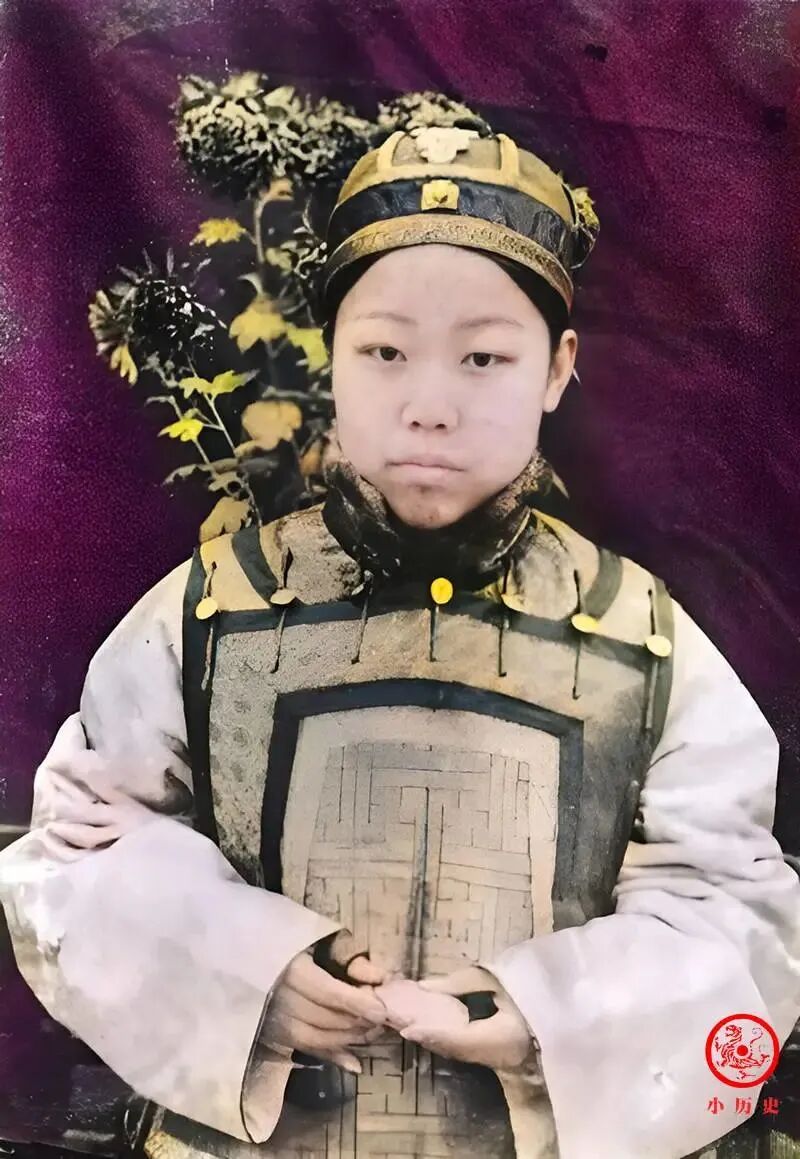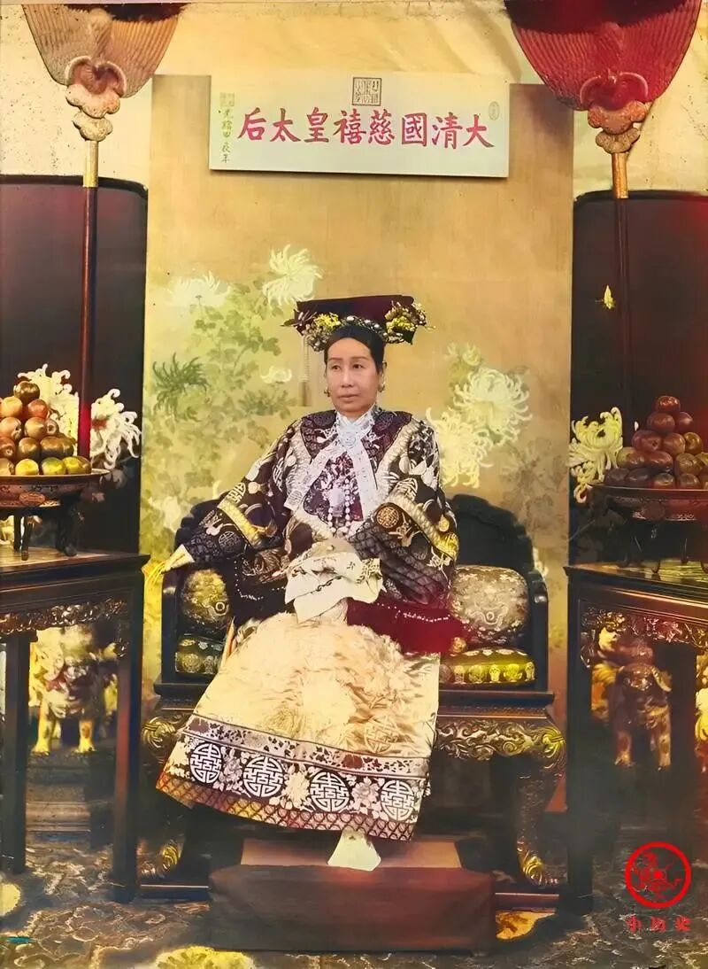 照片经过上色后,我们能看到慈禧所穿的服装异常精美,纹饰泛着金光。69岁的老太太坐在那里,虽然面带微笑,仍然有一种不怒自威的严肃。大家注意看她的脖子,略显粗大,那时候她患上了“大脖子病”,即甲状腺肿大。这种病在皇宫里并不罕见,光绪皇后也得过。