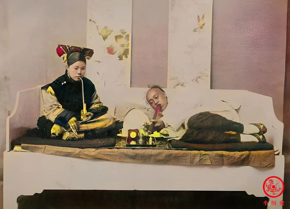 男子躺在床榻上吸鸦片,女子则坐着抽水烟,夫妻二人都有烟瘾。