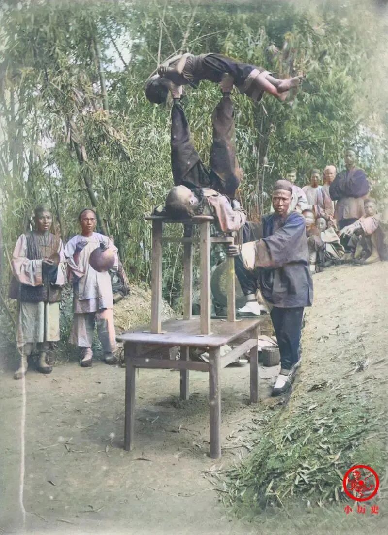 有人用桌椅搭建平台,然后一个成年人用双脚托起一个孩子,这个动作的关键在于保持平衡,否则那个孩子将被重重地摔下。以前老百姓的生活比较单调,看杂耍、看戏是为数不多的娱乐项目。