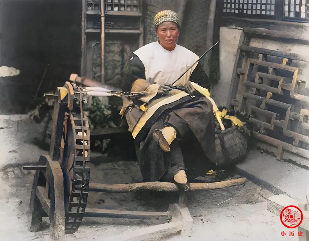 在明清礼教规范中,妇女无须在社会上扮演角色,只需要在家里生儿育女、打扫庭除、纺织缝纫,纺线就是基本功之一。她用着古老、笨重的木制纺车,大概是世世代代传下来的,吱吱嘎嘎,一天到晚不停歇。经过数月的纺线、织布,才能制成几匹粗布,满足一家人的生活所需。