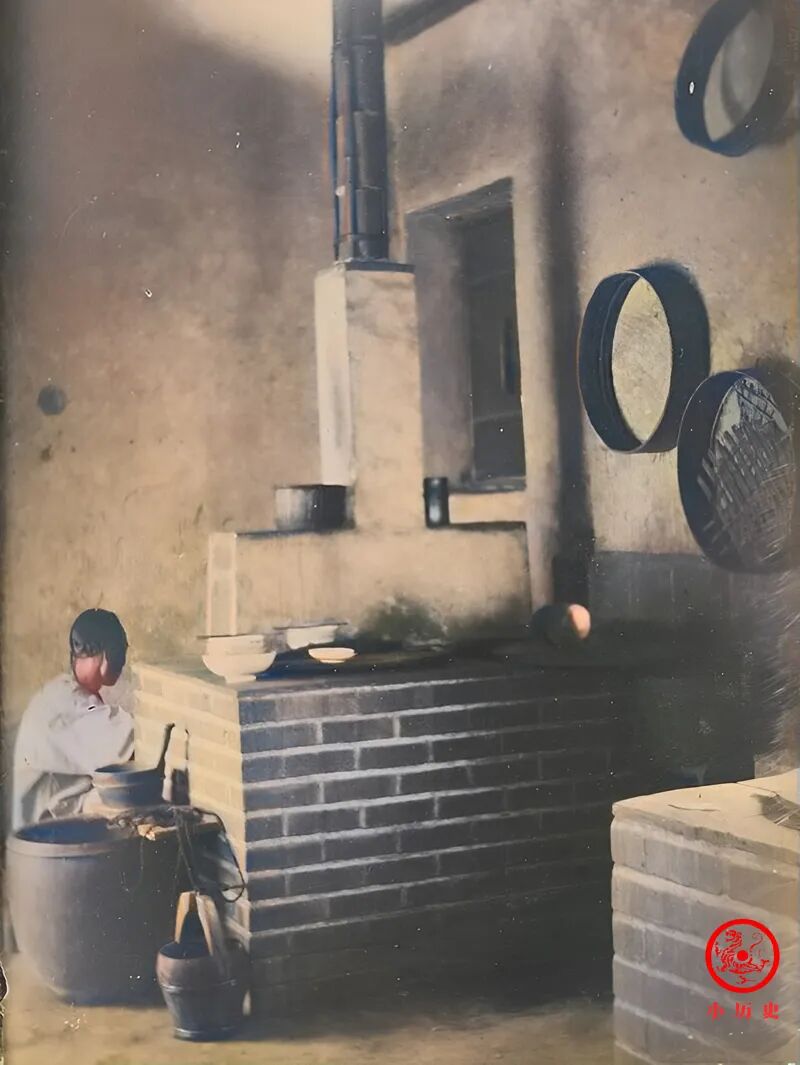 厨房宽敞整洁,他应该是地主老财家的厨师或者仆役。这样的照片难得一见,让我们看到了晚清大户人家生活的一个细节。