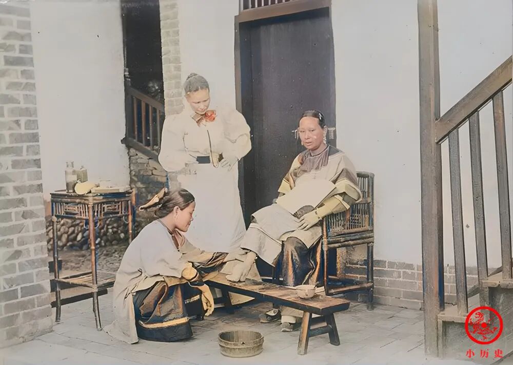 我们注意到,这位妇女是天足,没有裹成“三寸金莲”,在那个年代实属难得,少受了多少罪啊!在不同地区,缠足的风气也不一样。一般来说,北方更浓厚,南方相对好一些,像岭南有些地区妇女干脆不裹脚。