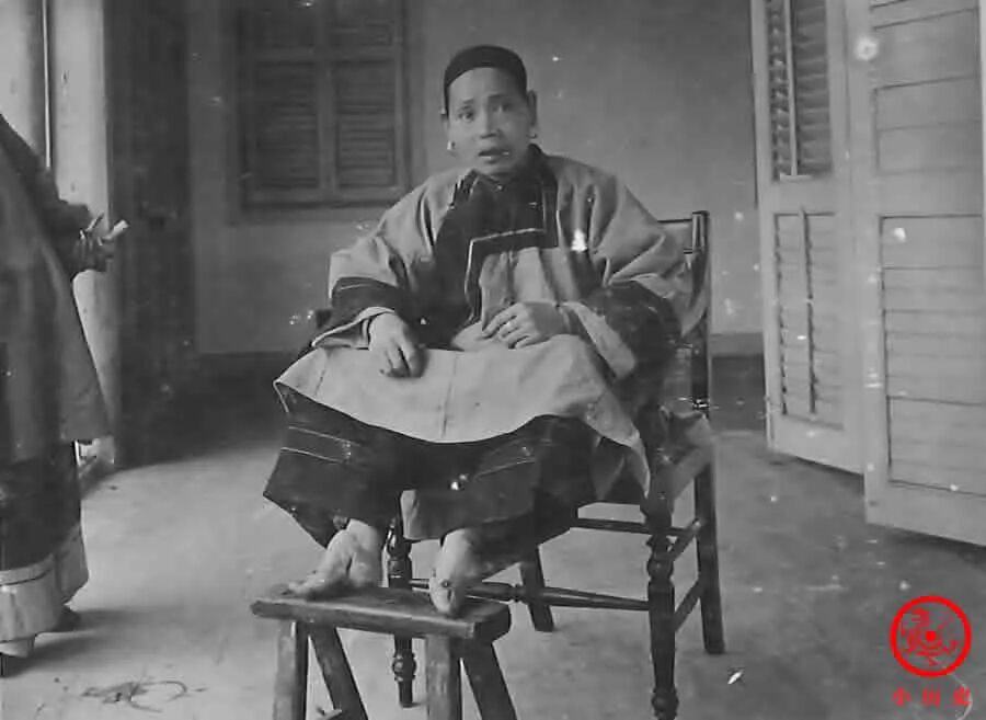 这位女子的双足已变得畸形,看着都疼。缠足陋习古已有之,到清朝时达到顶峰。男人为了恶趣味的审美,不惜戕害女性的身体。有些烂俗文人,还发展出一套匪夷所思的“金莲美学”,为缠足制定各种标准。如方绚所著《香莲品藻》对三寸金莲的式样、美丑做了详细分析,认为女人小脚有五式,即“莲瓣”、“新月”、“和弓”、“竹荫”、“菱角”。