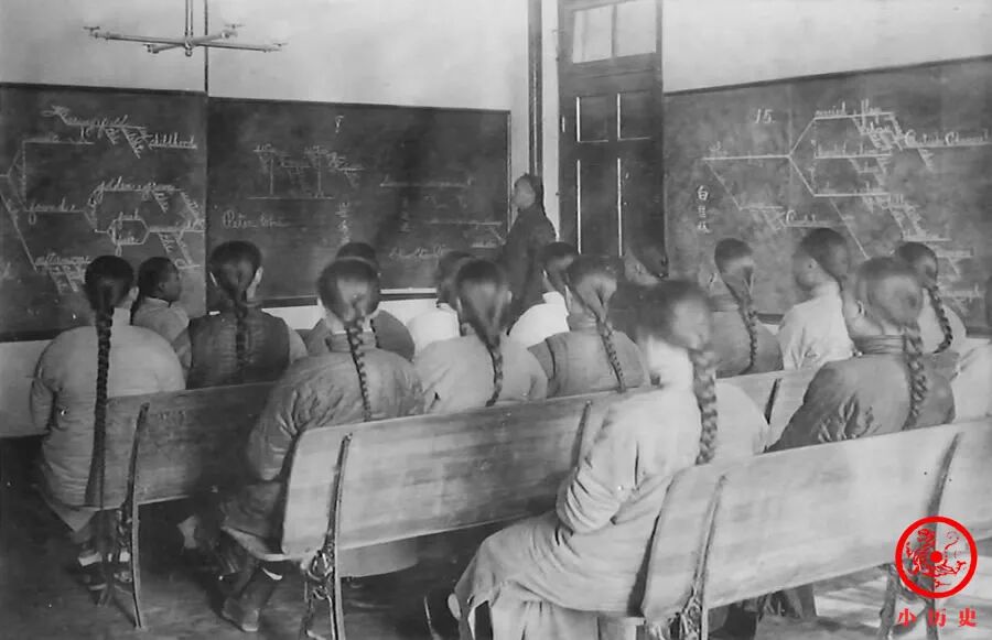 晚清最早一批大学堂出现在上海、北京等地,均是外国传教士办起的,而后朝廷和各省督抚有样学样,陆续建立官办大学堂。这张照片记录了University of Peking师生上英语课的场景,所有人都拖着又粗又长的大辫子,非常滑稽。需要注意的是,这所大学并非京师大学堂(北京大学),而是汇文大学堂。