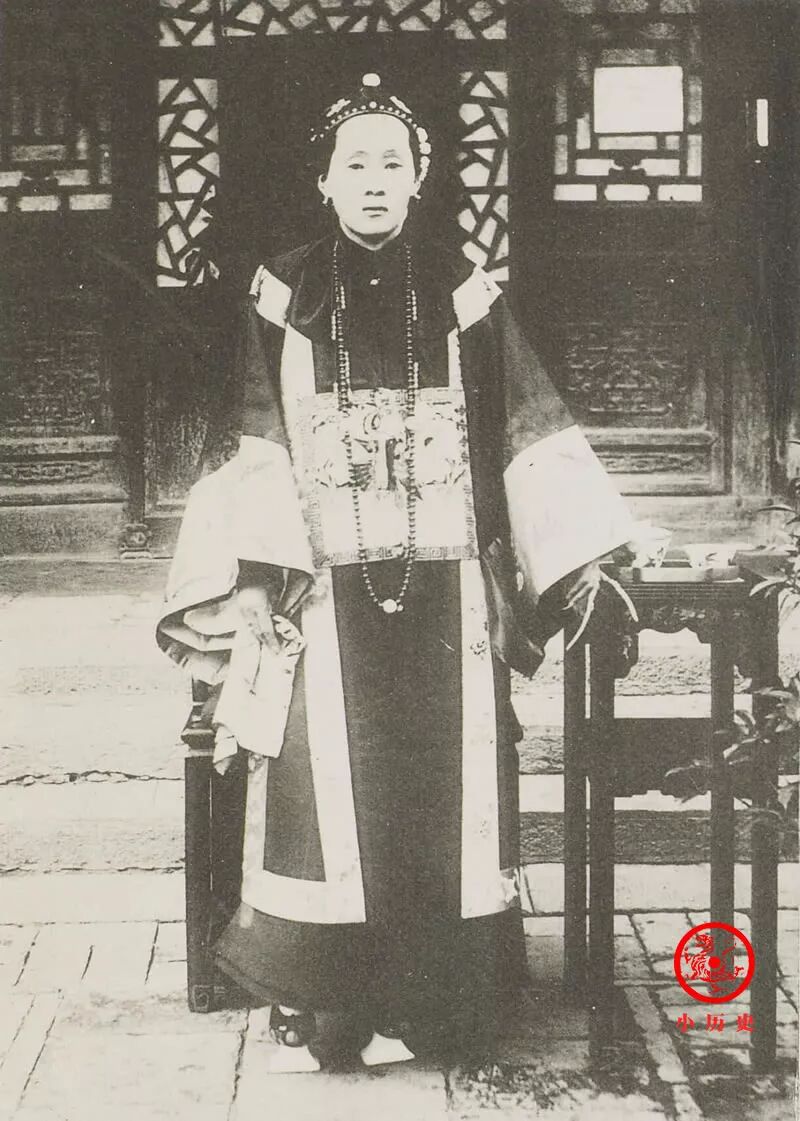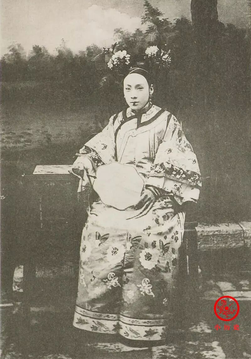 北京一位大臣的夫人。身穿袄裙、脚穿花盆底鞋,满汉合璧的装饰。