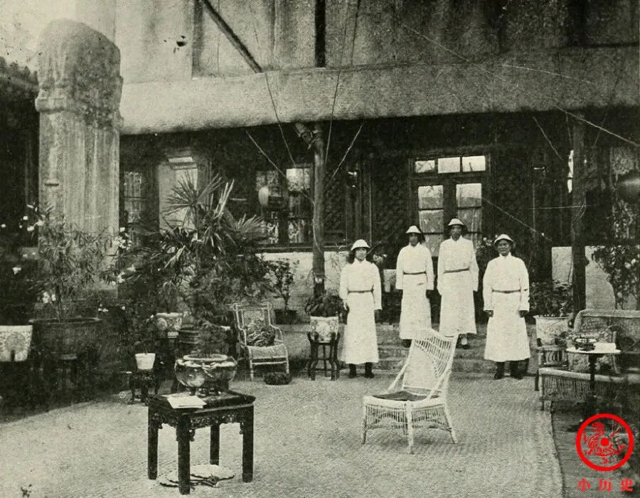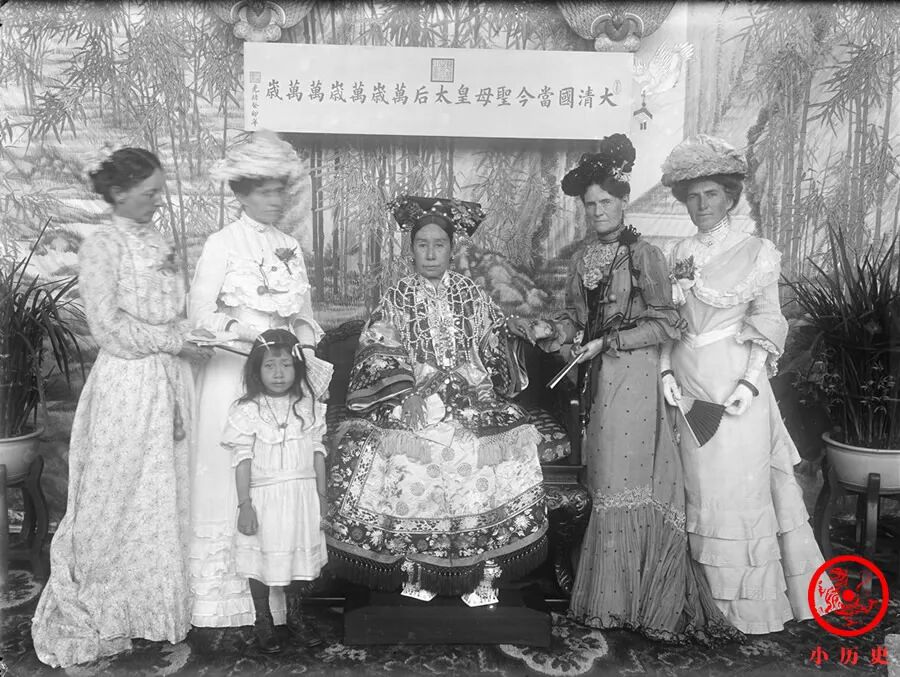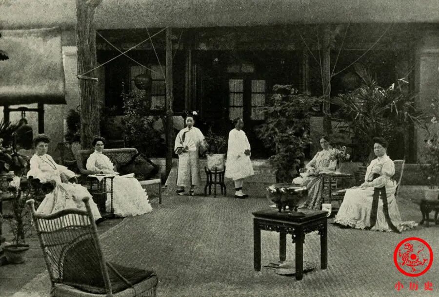 1903年12月26日,苏珊·康格在美国公使馆宴请荣寿固伦公主等人,场面很豪华,爱新觉罗家族的名媛基本上都在其中了。荣寿本是恭亲王家的格格,因认慈禧太后做养母,获得了公主身份,人称“大公主”。后排中间那位是担任翻译的德龄。