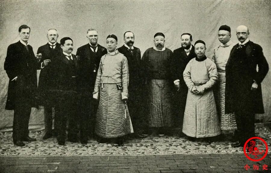 前排中间那位是庆亲王奕劻。当年他担任领班军机大臣,是实际上的行政首脑,深受慈禧太后信任。清朝上上下下没有过阳历年的习俗,他们是遵从西方惯例在这一天向外国使节致以新年问候。