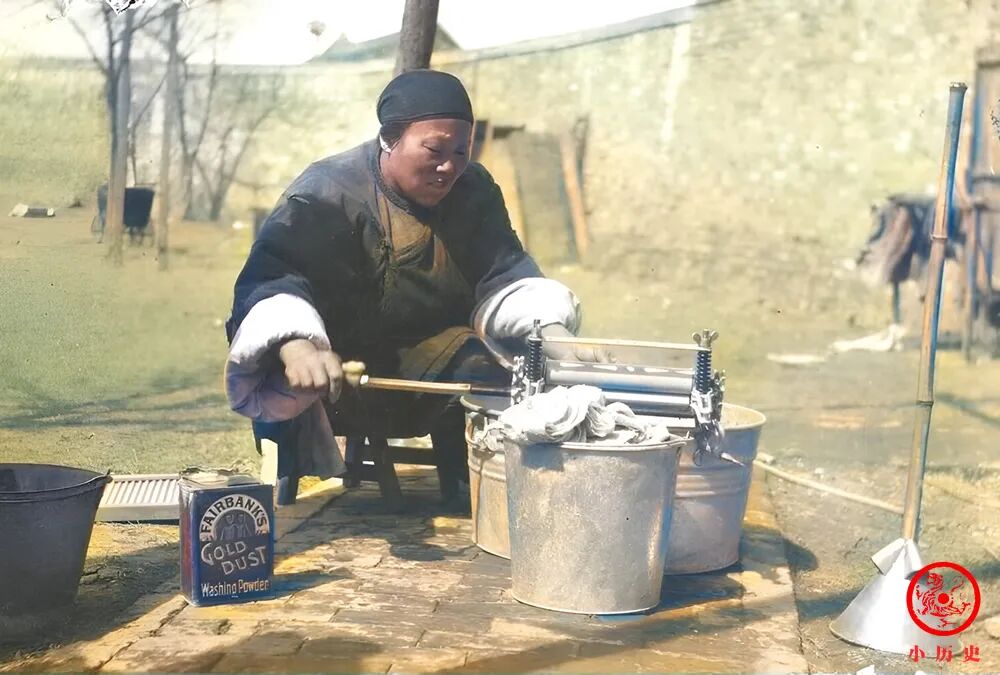 这位妇女是大户人家的女佣,她正在为东家洗衣服。显然她的东家很时髦,家里置办了手摇拧干机,洗好的衣服经过挤压,就拧掉了大部分水分,非常省力。另外,她身边还放着一罐洗衣粉,上面写着Fairbanks Gold Dust,属于进口产品,一般家庭哪能买得起啊?
