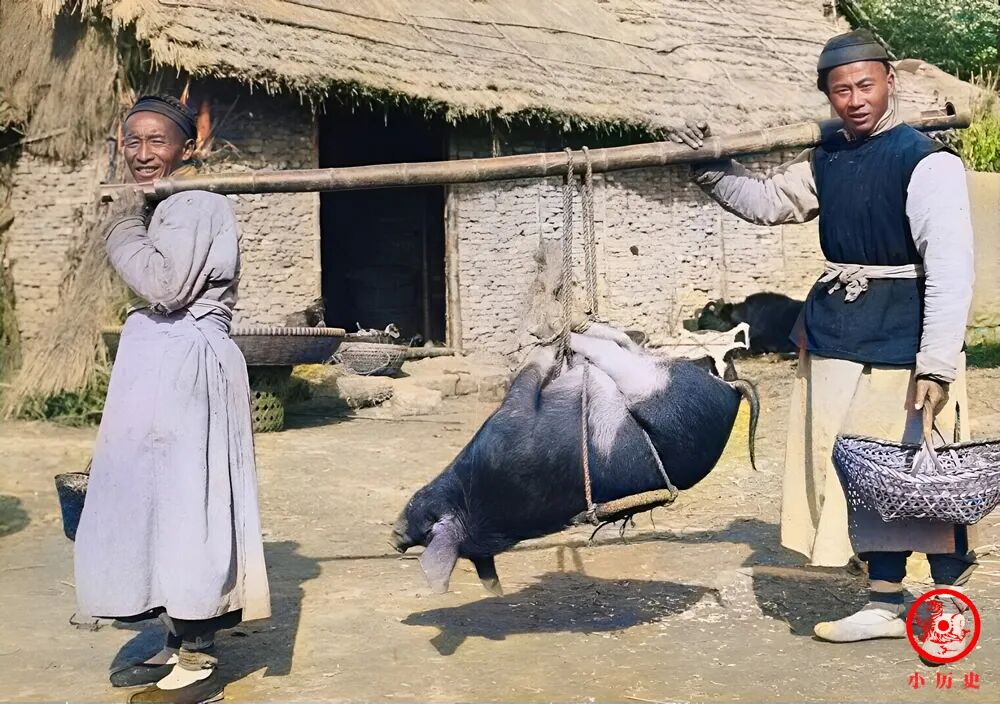 这户农家把猪养得膘肥体壮,重量超过200斤,父子两人抬到集市上出售,换一点散碎银两,买日常用品或者农具、种子之类的。农村家庭都会养鸡、鸭、猪、羊等家禽家畜,出栏之后根本舍不得吃肉,而是换成零花钱,应对日常开销。