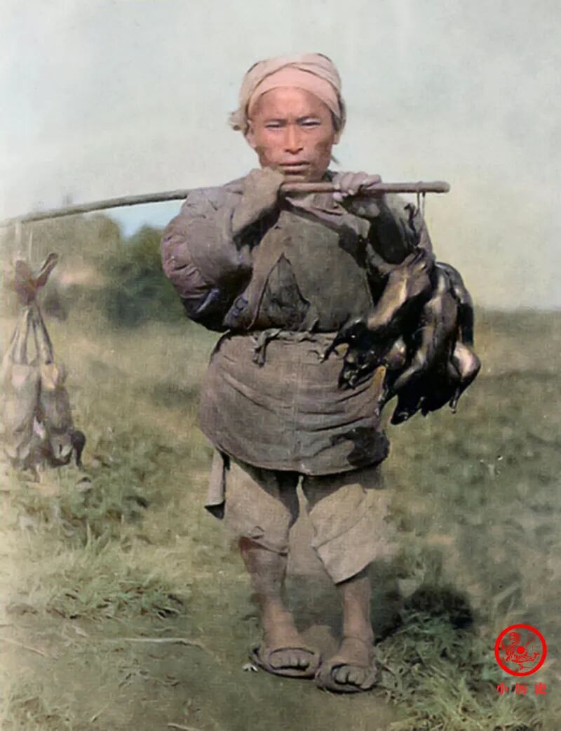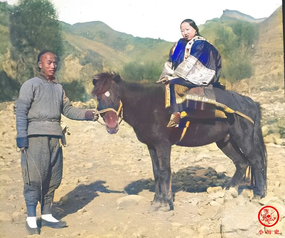 一个来自地主家的妇女,衣着光鲜,裹着“三寸金莲”,骑着马行走在崎岖的山路上。那个牵马的男子可能是她家的马夫,这是送她回娘家吧?清朝女子普遍裹脚,在这种坑坑洼洼的山里根本难以自如行走,必须借助车马等交通工具才能出门。