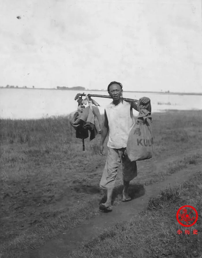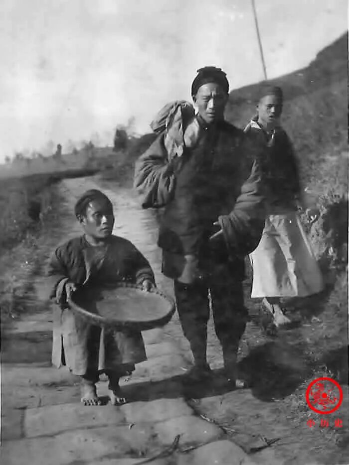 这位邮递员肩膀上的扁担一头挑着邮件,一头挑着他的衣服,可见已经马不停蹄地走了很远的路。这张照片的原注为“The fast mail”,即“快速递送”,我们可以叫他一声“快递小哥”了。只是步行送件的方式,与“快速”之名不相称。
