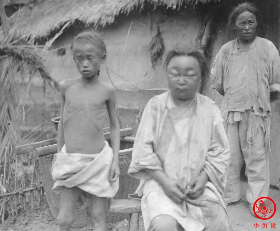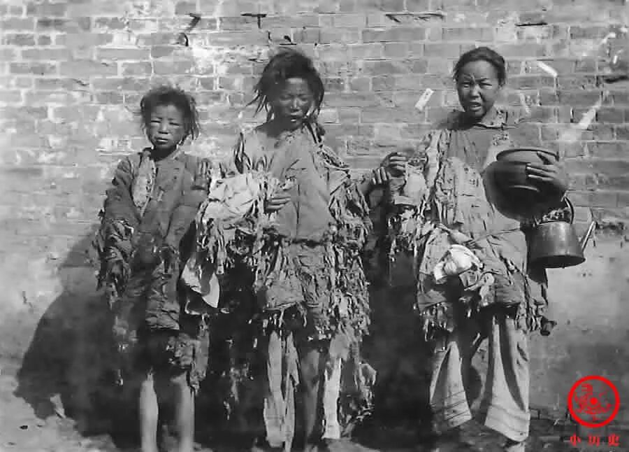 她们身上的衣服几乎烂成了碎布,可怜至极。手上拿着盆盆罐罐,或许已逃荒在外。