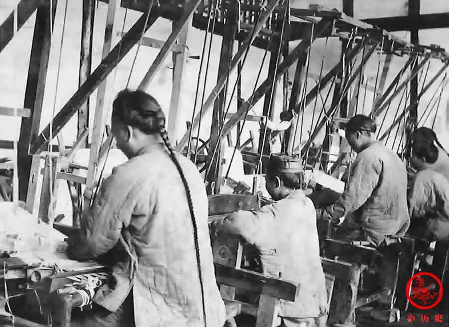 这是一家传统的纺织作坊,所用的织机比较落后,已经不适应时代发展趋势。晚清沿海、沿江大城市出现了不少纺织工厂,采用机器作业,生产效率高、成本低,冲击着小作坊生产。