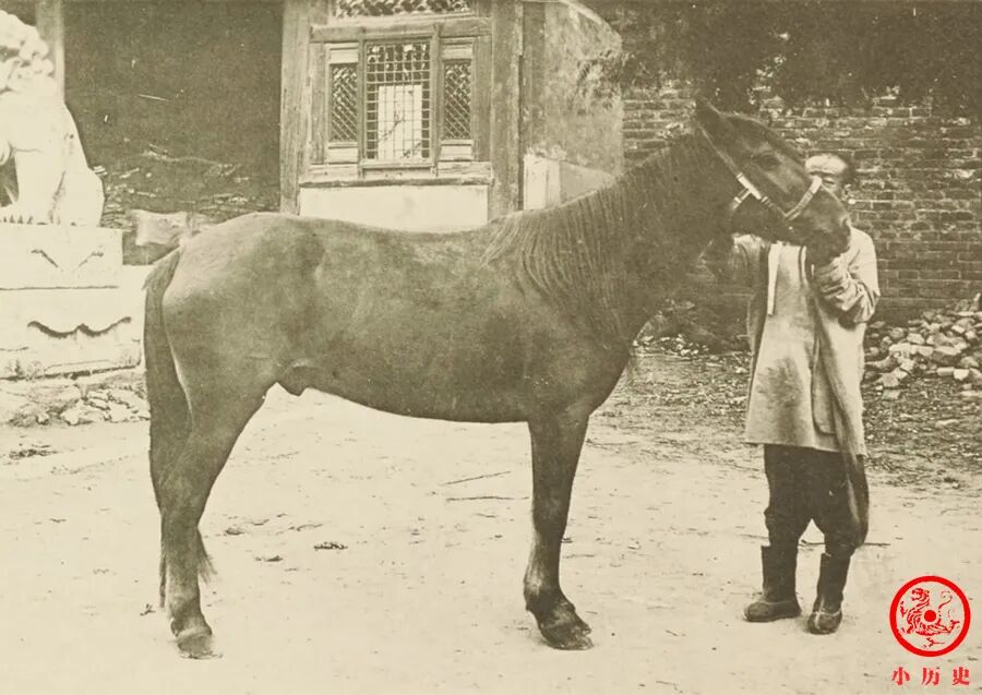 皇帝的马匹由内务府上驷院管理。内务府及其所属七司三院当中只有上驷院设在紫禁城内,位于东华门内太和殿左翼门外,便于皇帝用马。摄影师称这匹马产自伊犁,名为“赤龙”。此时,光绪帝逃跑了,它被遗弃在宫里,成了八国联军的战利品。