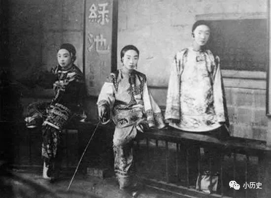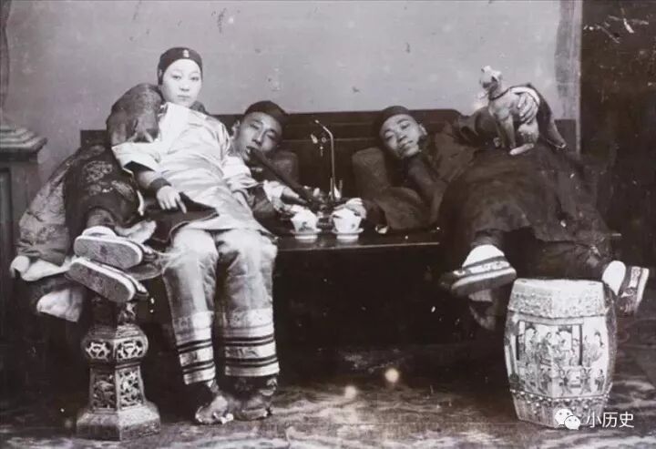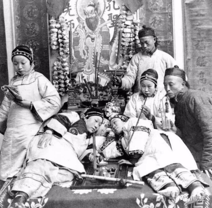 青楼女子陪顾客抽烟片,他们身后竟然挂着孔子像。