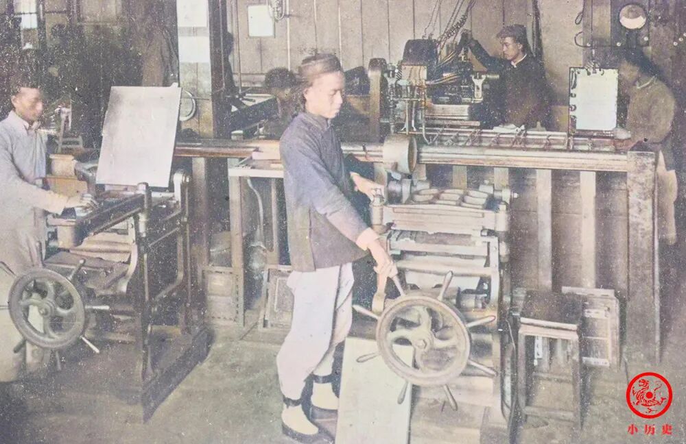 工人们正在熟练地操作机器,经手图书印刷过程中的关键流程。商务印书馆1897年创办于上海,甫一成立就引进西方先进设备,并且派员出国学习新技术,所以有研究者称她的创立标志着中国现代出版业的开始。此后,平装书逐渐取代了传统的线装书。