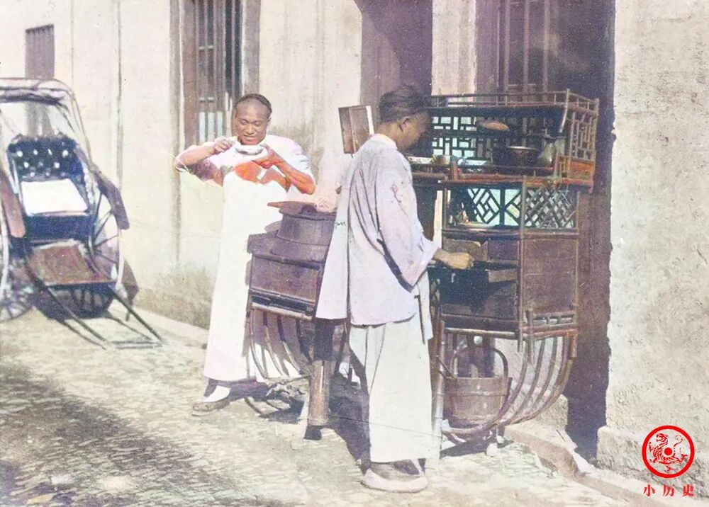 这是一个肩扛式的流动小吃摊,一头是锅炉,一头是装食材、餐具的盒子,简单而完整,麻雀虽小五脏俱全。拉人力车的车夫大哥在长时间的奔跑之后,累了饿了,停下来吃一碗饭补充能量。他吃的是什么呢?我猜是馄饨或者面条,此类简餐出锅比较快,适合流动小摊叫卖。现在,这种流动小摊仍然存在于城市的角落,只是肩扛式的工具变成了电动三轮。