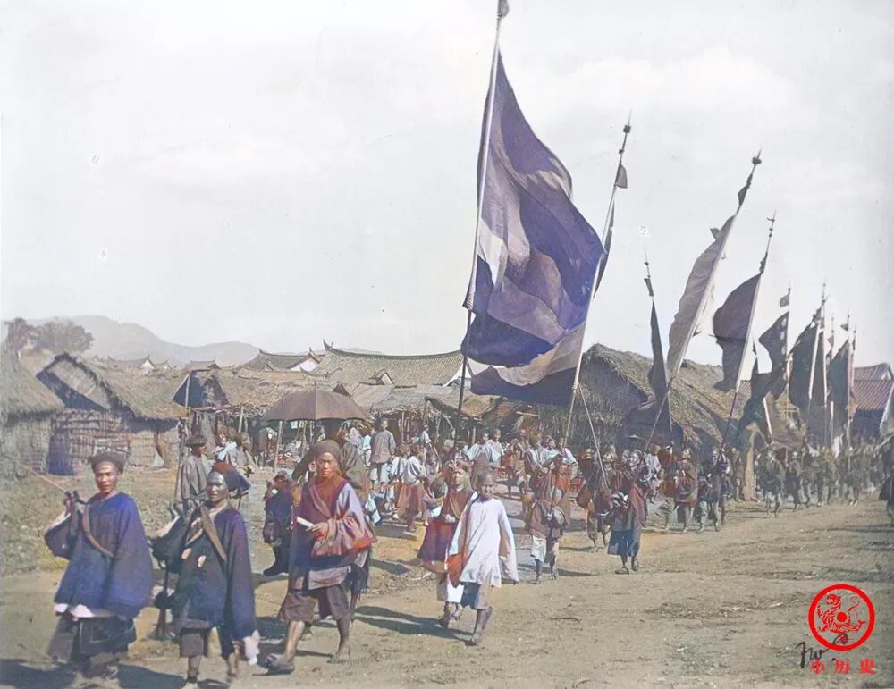 这一幕发生在云南农村,村民们举着彩旗喜迎新年。清朝过年叫“元旦”,那个时候还没有“春节”的叫法。清朝灭亡之后,才把1月1日定名为元旦,过大年定名为春节。