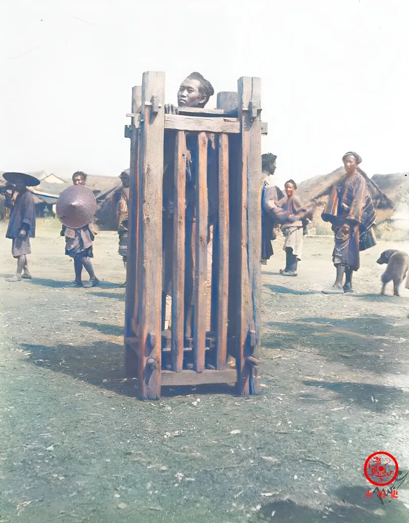 这个小偷被捕后接受站笼惩罚。站笼是在戴枷示众基础上改造而来的,能给犯人带来更加痛苦的感受。《大清律例》对这种刑罚没有规定,属于法外之刑,地方官经常使用。罪行不是很重的囚犯,在里面关押一定时间后就被放出;罪行严重的,脚下的木板会被抽掉,囚犯将慢慢窒息而亡。