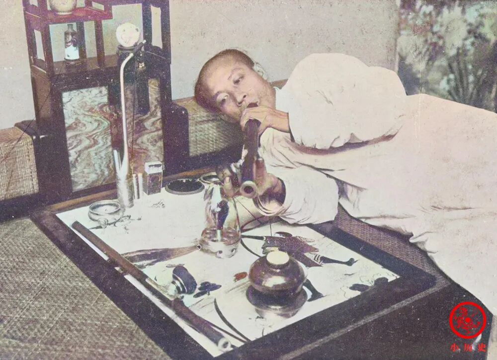 男子斜躺在床榻上,正在吞云吐雾,沉醉其中不能自拔。这张照片展示了一个瘾君子所需要的全部器具,有烟膏盒、有火柴,最显眼的当然是烟枪(男子用着一支,他面前还摆着一支),然后是烟灯(炙烤烟膏产生有香甜气味的烟雾,然后吸食)。晚清时期,无数瘾君子精神颓废,甚至为此家破人亡。