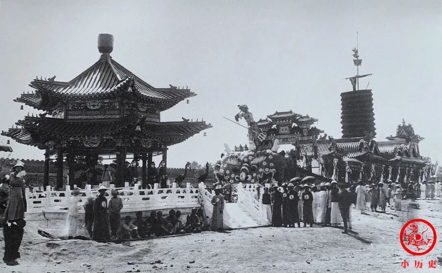 1908年11月16日,慈禧太后去世,之后在皇极殿停灵。1909年中元节,溥仪小朝廷为她举行了一次大祭。内务府营造司在东华门外扎制了规模庞大的纸活冥器,其中包括照片中清晰可见的法船。