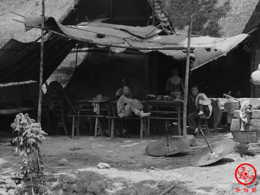 这个饭铺十分简陋,只是搭了临时草棚遮挡阳光和风雨,但是它为往来的行人提供了一个歇脚和补充能量的地方。照片记录了一个具有烟火气息的场景。