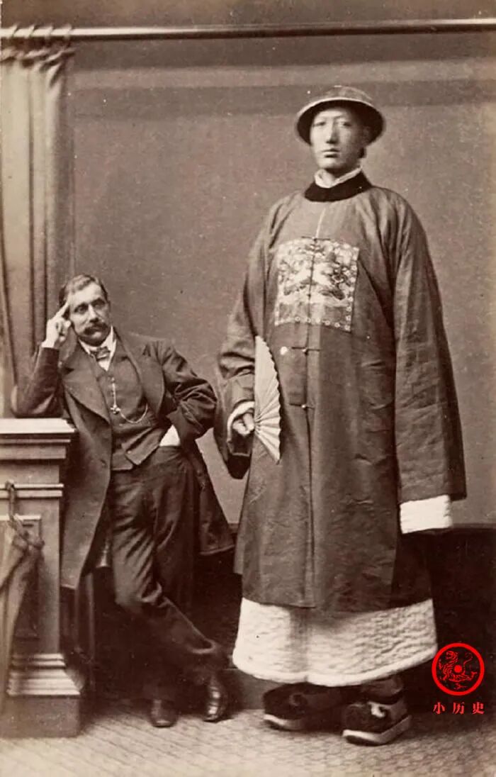 目测这位巨人的身高超过了2米。他穿着只有官员才能穿的补服,并不能说明他获得了官职。他只是被外国演艺机构发掘的演员,凭借出众的身高表演杂耍,那身补服用来向外国人展示他作为中国人的身份。
