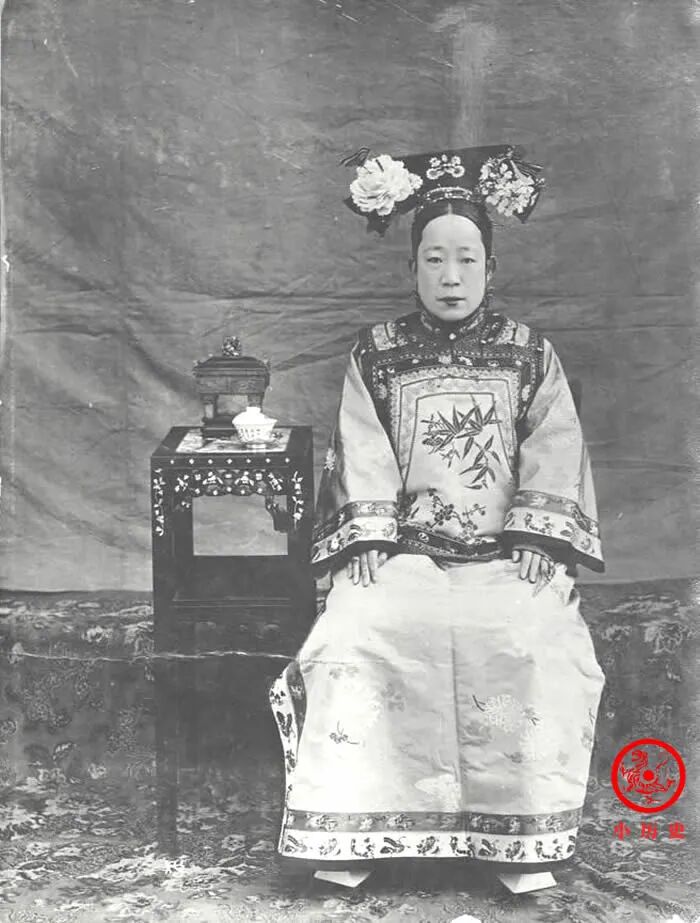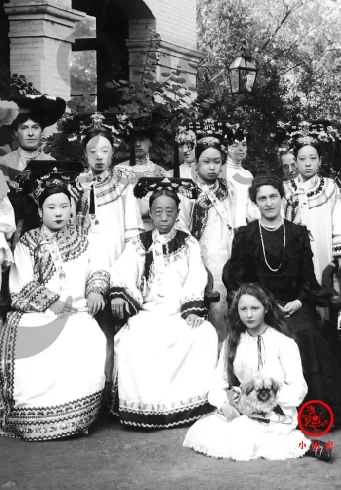前排中间坐着的那位就是荣寿固伦公主,她是大清王朝的最后一位公主,同时也是一位有着特殊出身的公主。她出生在恭亲王府,按清朝制度只能封为格格。但她被慈禧太后接到宫中抚养,获得皇女身份,因此也就有了做公主的资格。她聪明伶俐能说会道,经常陪太后唠嗑解闷,深得太后宠爱。
