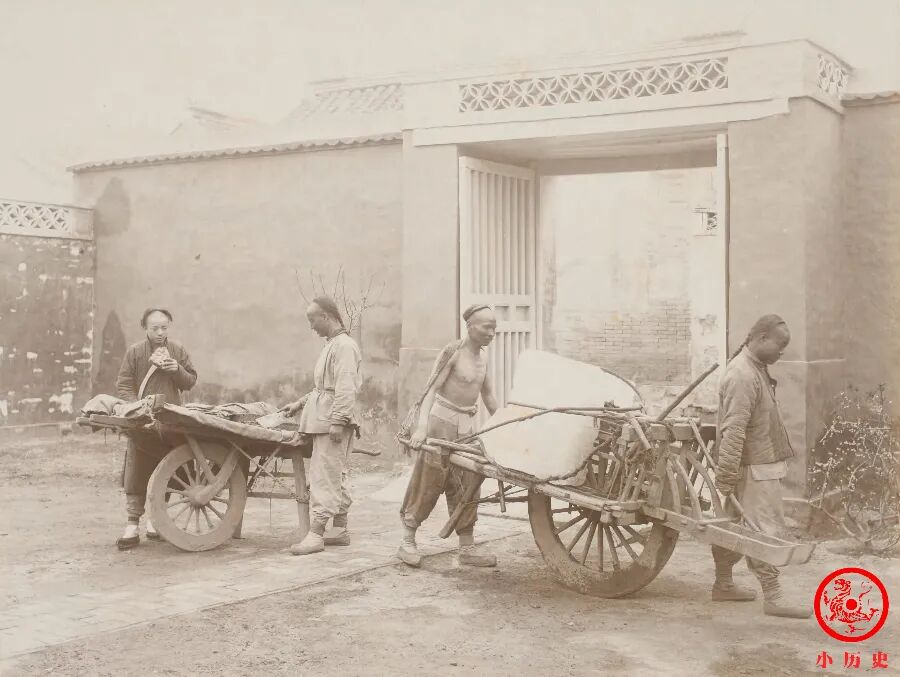 左边独轮车在卖小吃,顾客已经拿起一块吃了起来。右边独轮车在运输冰块,运到王公大臣和富商府第,供他们消暑降温。那个年代电冰箱尚处于研制阶段,达官贵人在三伏天使用的冰块来自隆冬时节的储藏。老北京有专门的店铺采冰、储冰,然后到夏季出售。当然,普通家庭是买不起的。