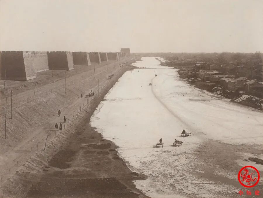 这张照片记录了丰富的历史信息。画面中出现了内城城墙、东南角楼、城墙根的土路、护城河、外城的房屋等等,展现了老北京的局部风貌。护城河已经结冰,有人在河面上玩冰车。