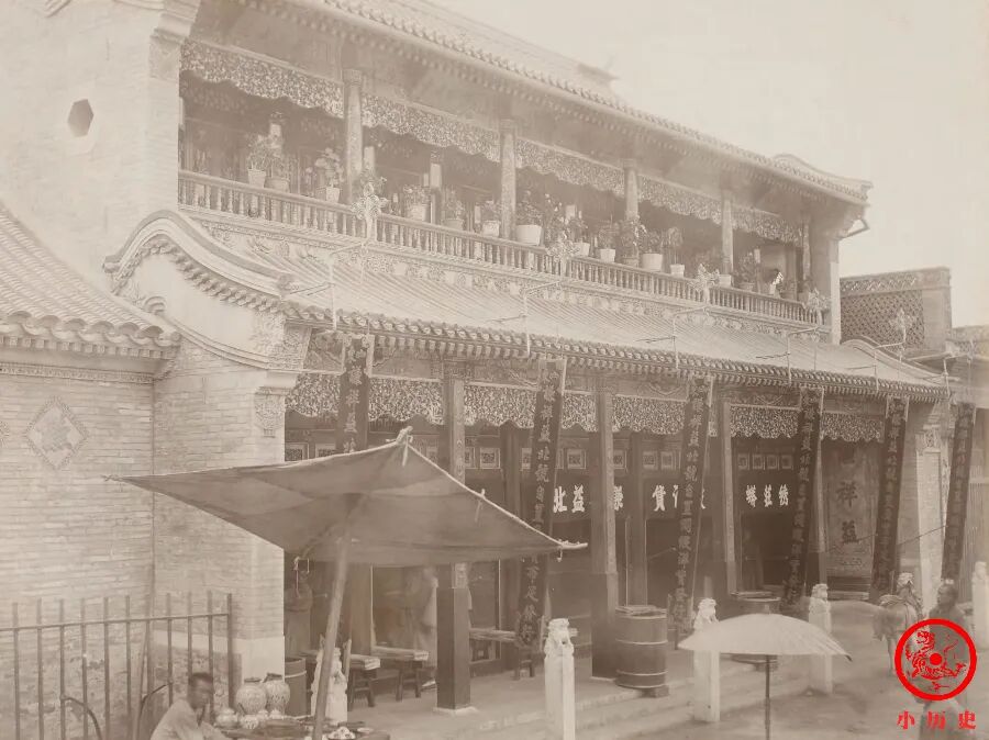 照片记录了一个典型的老戏园子,戏台正方形,前后台由上场门和下场门连通,四角有明柱支撑台顶。戏台下摆着八仙桌,围坐的观众均穿官服,另有几位外宾,看来正在举办一场公务戏曲演出。