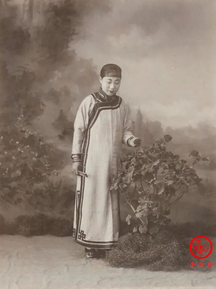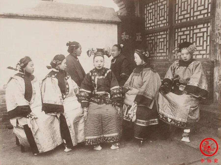 前排五人中,右一、右三两人的穿着打扮都是典型的旗人风格;右二是典型的汉人妇女风格;左一、左二两人则很特别,服装是汉人风格,鞋子则是旗人的花盆底鞋,满汉合璧,很可能是汉军旗人。