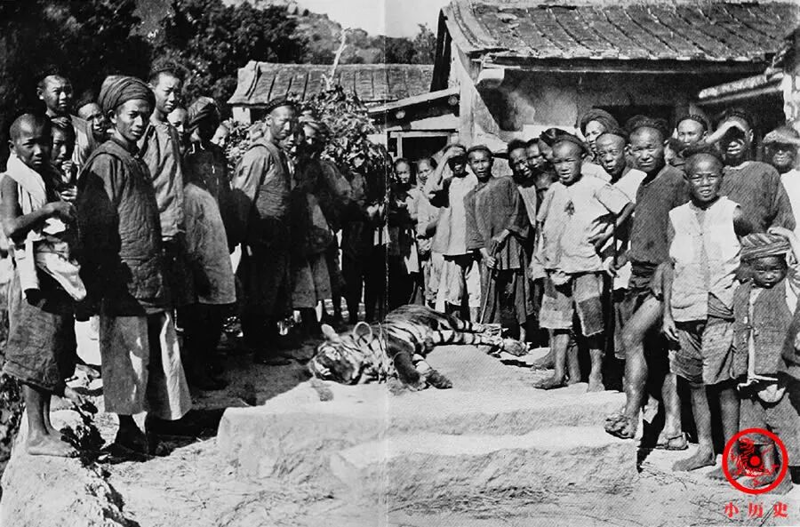 最终猎人们捕杀了这只老虎,把它抬到了村子里。这引起村民的围观,他们很兴奋,对着死去的老虎说说笑笑、指指点点。